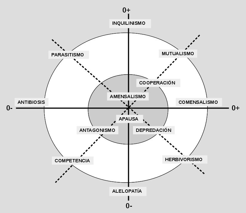 (3) Figura, tomada de E.P.Odum y F.O. Sarmiento, F. O. (1997), Ecología. El puente entre ciencia y sociedad, McGraw-Hill, p.188. Como se ve, estos autores describen hasta trece interacciones entre organismos y especies (encuadrándolas en un sistema de coordenadas en que el positivo es beneficioso, el negativo perjudicial y el cero neutro) de las cuales dos , el mutualismo y la cooperación son beneficiosas para ambos; otras dos, el comensalismo y el inquilinismo, son beneficiosas para uno y neutras para el otro; tres, parasitismo, depredación y herbivorismo benefician a unos y perjudican a los otros; y el resto, o son neutras o perjudican a algunos.